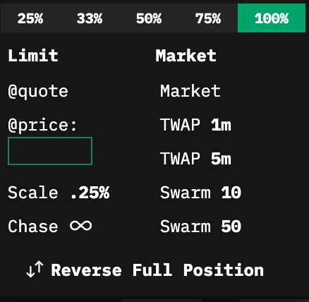 The Limit column offers a variety of limit order types to close a position; @quote places a reduce limit order at current best bid/ask, @price places a reduce limit order at a price specified by the user, Scale .25% scales 10 limit orders in a 0.25% price range from current best bid/ask, Chase initiates a chase order type to close the position.