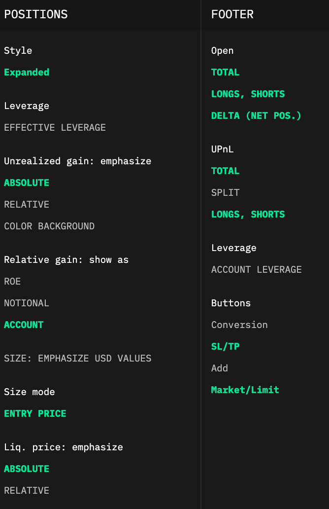 Global Settings: Click on the double cogs/wheels icon to open the Global Settings for all Position Components. You can toggle Legacy Close Buttons, Simplified PnL information, Denial mode and Nuke Account Positions Button.