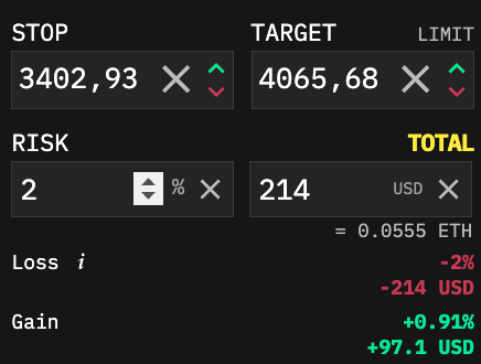 You will have the possibility to input your desired Risk in % of your Account (Total or Available, click to switch) or in the denominated currency ($USD, BTC, etc., depending on the contract). According to your chosen Risk, Entry and Stop price, the order Size will be set automatically via this formula: position size = risk / (entry - stop).