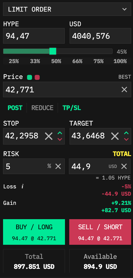 • TP -- Take Profit order. A convenience, places a taker exit order at the given price. Also calculates account growth if hit.