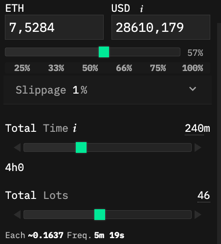 Time Weighted Average Price execution of a large order. A Total Size is divided into the given number of Total Lots which are then executed one by one across the given Total Time at regular intervals (“Order Frequency”).